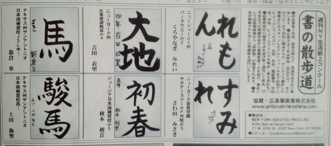 2014年6月23日 月曜日 筆 「週刊NY生活」の紙上書道コンテスト6月の優秀作品発表。 当社が協賛しているNYの「週刊NY生活」の紙上書道コンテスト。 6月の優秀作品発表。 「週間NY生活」デジタル版は下記ウェブサイトからご覧頂けます。6月21日号のP23です。 「週間NY生活」デジタル版