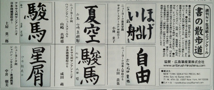 2014年8月27日 水曜日 筆 「週刊NY生活」の紙上書道コンテスト8月の優秀作品発表。 当社が協賛しているNYの「週刊NY生活」の紙上書道コンテスト。 8月の優秀作品発表。 「週間NY生活」デジタル版は下記ウェブサイトからご覧頂けます。8月16日号のP23です。 「週間NY生活」デジタル版