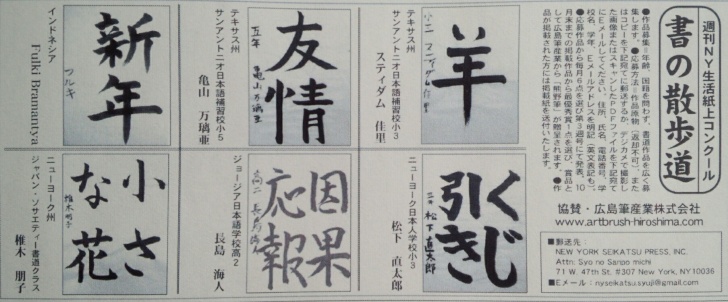 2015年3月20日 金曜日 筆 「週刊NY生活」の紙上書道コンテスト3月の優秀作品発表。 当社が協賛しているNYの「週刊NY生活」の紙上書道コンテスト。3月の優秀作品発表。 「週間NY生活」デジタル版は下記ウェブサイトからご覧頂けます。3月21日号の18ページです。 「週間NY生活」デジタル版