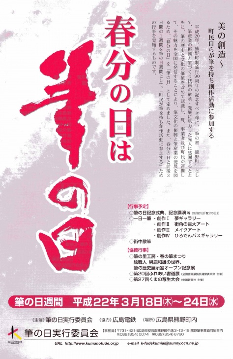 2010年3月5日 金曜日 筆 まもなく「筆の日」週間です。 来る3月21日(春分の日)を「筆の日」として、その前後3日間を含めた1週間を「筆の日週間」と銘打って、筆の里工房を中心に「筆」と「書・画」にまつわるイベントが行われます。また、町内の筆/化粧筆の製造業者が、それぞれの作業場の案内・販売や秘蔵文化財の展示などを行ない、旧中心市街地とその周辺が多くの観光客で溢れます。期間中の土/日/祝日は無料シャトルバスを利用すればなお一層便利です。春の一日を「筆の日週間」でお楽しみ下さい。