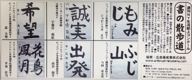 「週刊NY生活」の紙上書道コンテスト11月の優秀作品発表。
