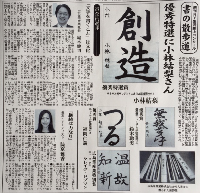 「週刊NY生活」の紙上書道コンテスト2015年度の年間最優秀作品発表。