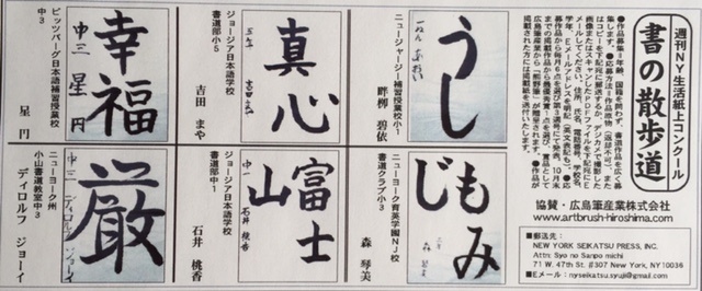 当社が協賛しているNYの「週刊NY生活」の紙上書道コンテスト。1月の優秀作品発表。