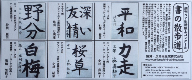 当社が協賛しているNYの「週刊NY生活」の紙上書道コンテスト。3月の優秀作品発表。