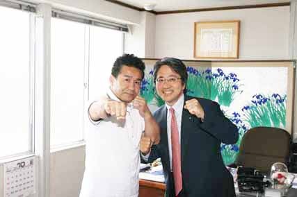 去る10月1日、弊社は月刊経営情報誌「報道ニッポン」の取材を受けました。インタビュアーは「とかちゃん」の愛称でおなじみの元WBAジュニアフライ級チャンピオン渡嘉敷勝男さんで、事業に対する考え方、セールスポイントやこだわり、将来の夢や展望など、弊社社長城本健司と約2時間、独特のユーモアを交え和やかな雰囲気の取材でした。和やかな中で「的を射た」渡嘉敷さんのインタビューは、一つのスポーツのジャンルの中で「世界の頂点」に立った人の「さすが・・・」を感じさせるものでした。ありがとうございました。写真はインタビューのあとガッツポーズを決める渡嘉敷さん(左)と弊社城本社長(右)