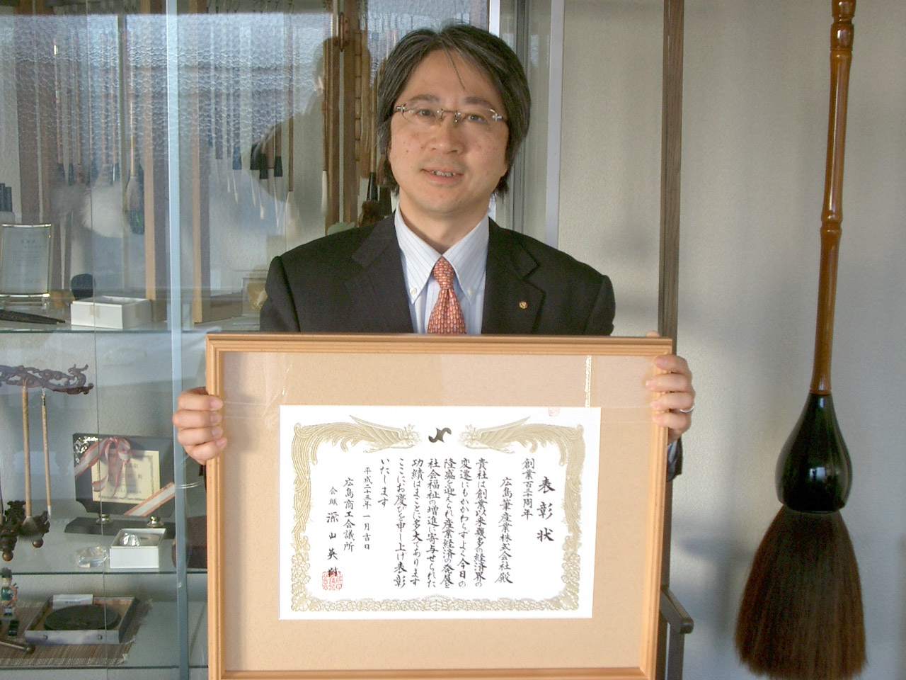2011年1月31日 月曜日 筆 永年継続企業表彰を受賞しました。 明治14年創業から130周年を迎えた弊社は、広島商工会議所より永年継続企業として表彰されました。1/31に表彰式が行われ、伊藤副会頭から表彰状が授与されました。 写真は賞状を手にする弊社城本社長です。