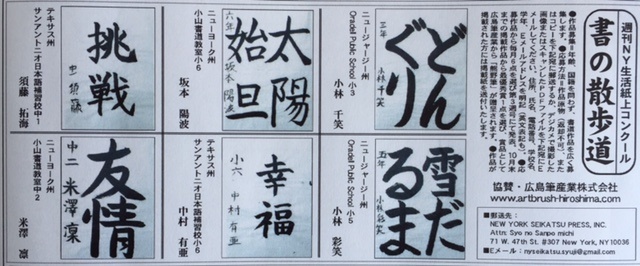 当社が協賛しているNYの「週刊NY生活」の紙上書道コンテスト。5月の優秀作品発表。