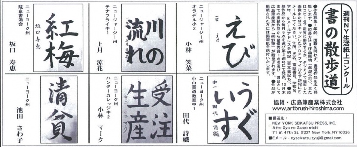 2017年5月20日 土曜日 筆 「週刊NY生活」の紙上書道コンテスト5月の優秀作品発表。 当社が協賛しているNYの「週刊NY生活」の紙上書道コンテスト。5月の優秀作品発表。 「週間NY生活」デジタル版は下記ウェブサイトからご覧頂けます。5月20日号の19ページです。 http://www.nyseikatsu.com/editions/631/html5/index.html