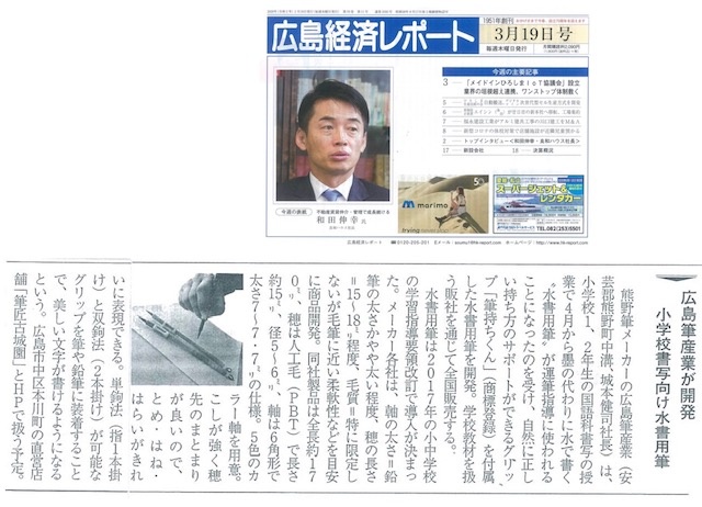 「広島経済レポート」3月19日号で当社の水書用筆「筆持ちくん」付きが紹介されました!