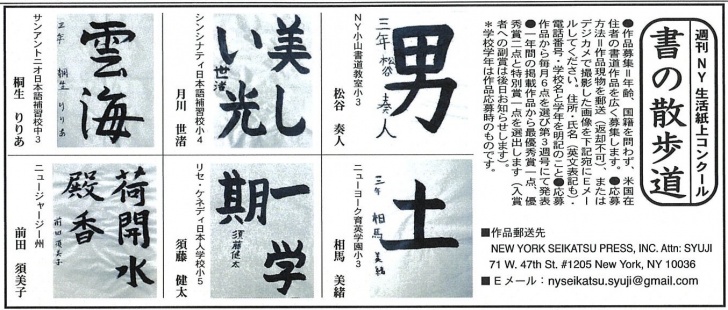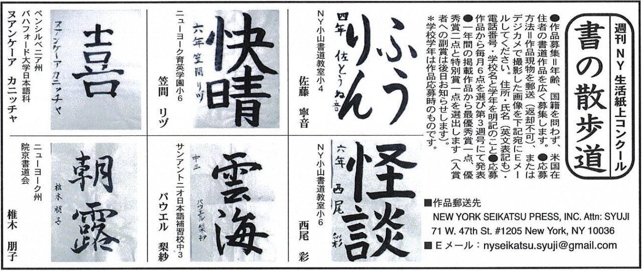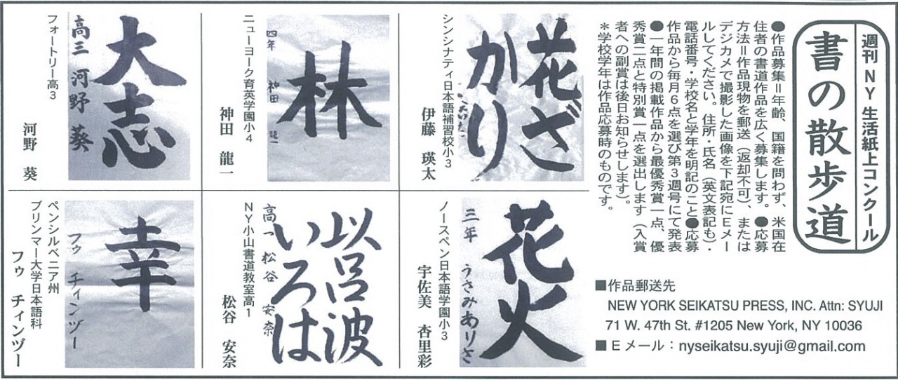 2022年8月20日 土曜日 筆 「週刊NY生活」の紙上書道コンテスト。8月の優秀作品発表。 当社が協賛しているNYの「週刊NY生活」の紙上書道コンテスト。 8月の優秀作品を発表します。 年間優秀作品には副賞として当社の熊野筆の書道筆をお贈りします。 是非ご参加ください!