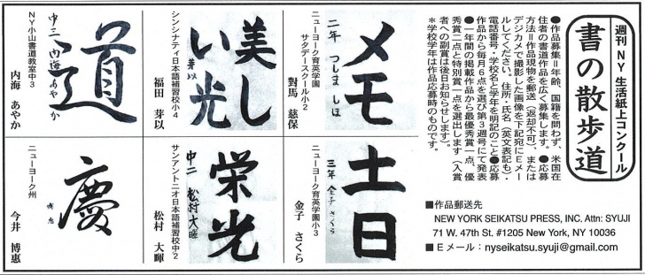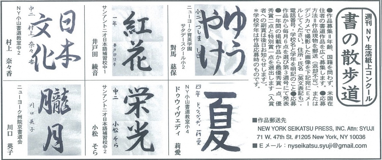 2022年7月16日 土曜日 筆 「週刊NY生活」の紙上書道コンテスト。7月の優秀作品発表。 当社が協賛しているNYの「週刊NY生活」の紙上書道コンテスト。 7月の優秀作品を発表します。 年間優秀作品には副賞として当社の熊野筆の書道筆をお贈りします。 是非ご参加ください!