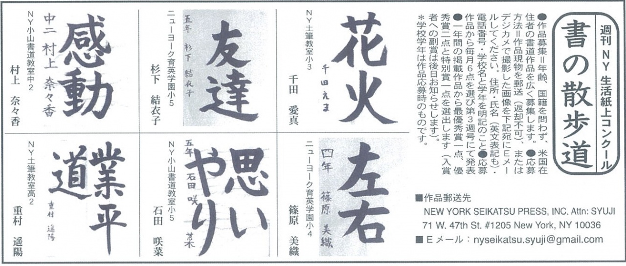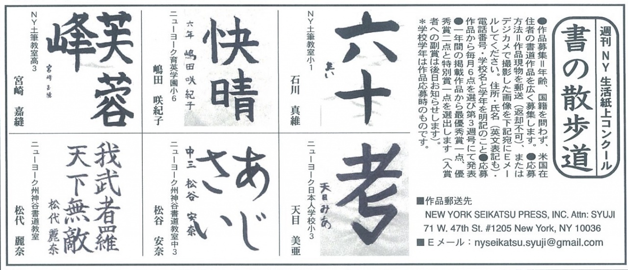 2021年8月21日 土曜日 筆 「週刊NY生活」の紙上書道コンテスト。8月の優秀作品発表。 当社が協賛しているNYの「週刊NY生活」の紙上書道コンテスト。 8月の優秀作品を発表します。 年間優秀作品には副賞として当社の熊野筆の書道筆をお贈りします。 是非ご参加ください!