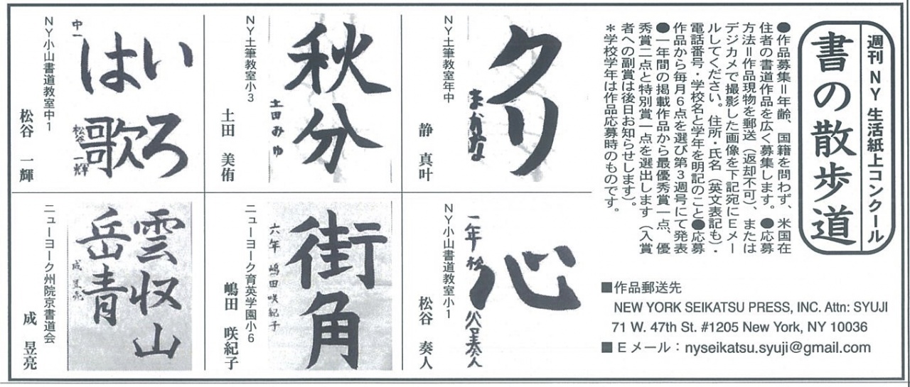 2021年9月18日 土曜日 筆 「週刊NY生活」の紙上書道コンテスト。9月の優秀作品発表。 当社が協賛しているNYの「週刊NY生活」の紙上書道コンテスト。 9月の優秀作品を発表します。 年間優秀作品には副賞として当社の熊野筆の書道筆をお贈りします。 是非ご参加ください!