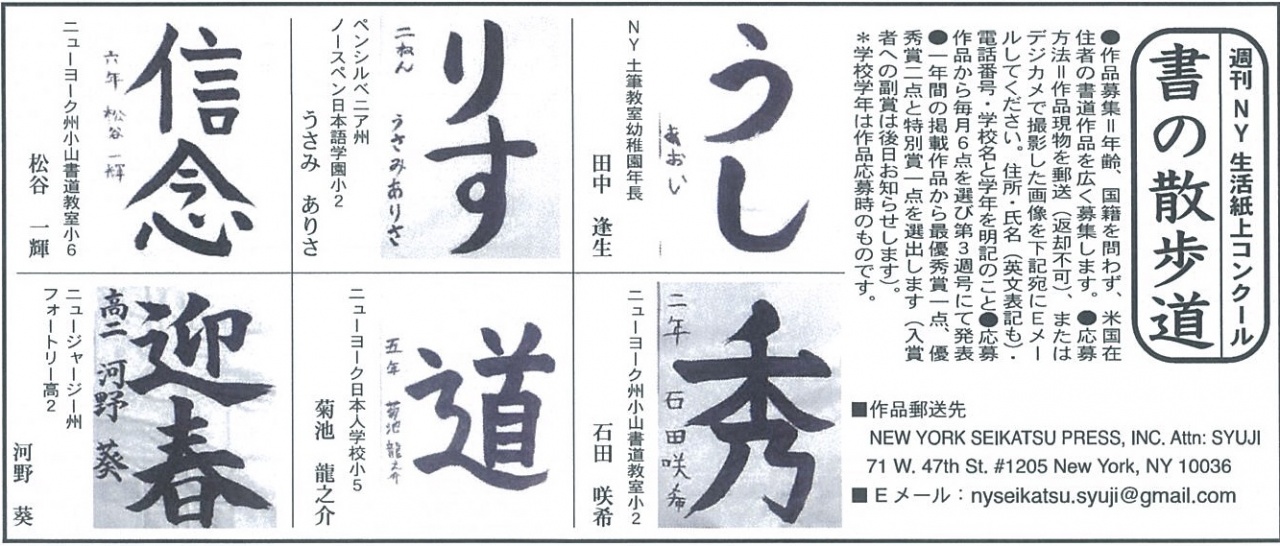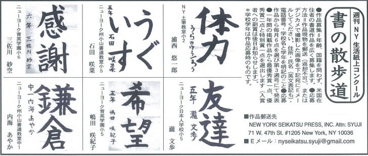 当社が協賛しているNYの「週刊NY生活」の紙上書道コンテスト。