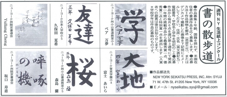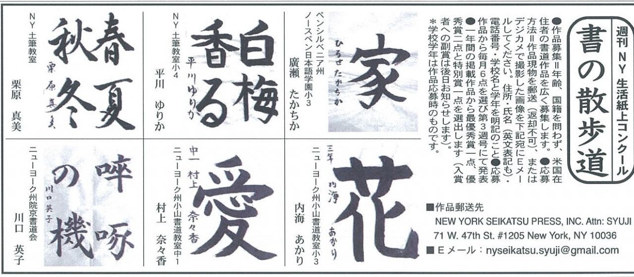 「週刊NY生活」の紙上書道コンテスト。3月の優秀作品発表。