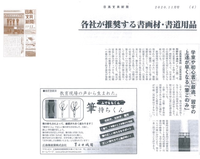 「日本文具新聞 11月号」の「日本の文化を育てる書画材・書道用品」の特集欄で当社の書道筆の「筆ごのみ」と「筆持ちくん」(こちらは広告です)が紹介されました!