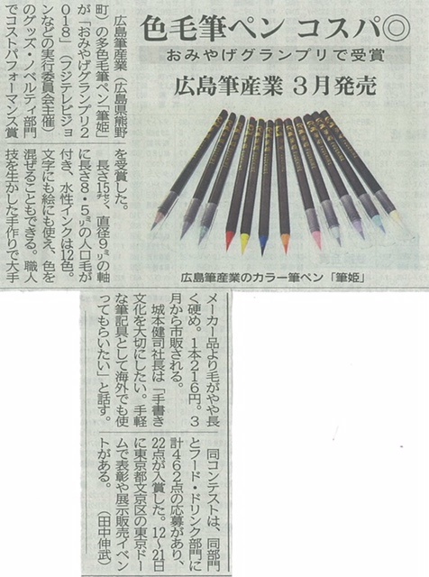 1月11日の地元紙「中国新聞」で、当社の「筆姫」が「おみやげグランプリ2018」でコストパフォーマンス賞を受賞したことを紹介する記事が掲載されました。