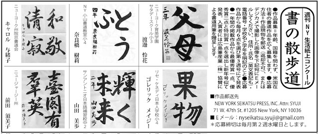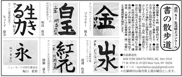 「週刊NY生活」の紙上書道コンテスト。9月の優秀作品発表。