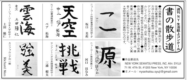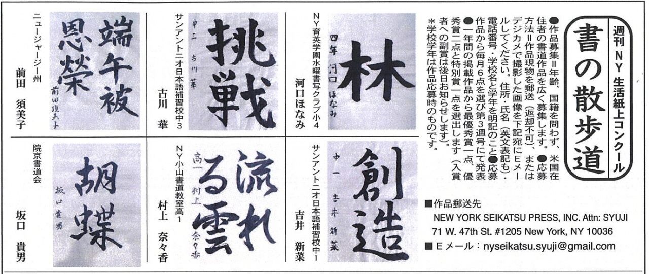 「週刊NY生活」の紙上書道コンテスト。8月の優秀作品発表。