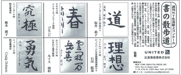 The excellent "shodo" (calligraphy) work announcement in July at the "shodo" contest in "Shukan NY Seikatsu" (Newspaper in NYC) which we sponsor.