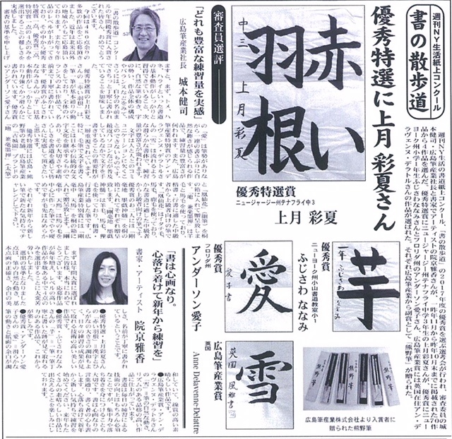 The excellent "shodo" (calligraphy) work announcement in the Year of 2017 at the "shodo" contest in "Shukan NY Seikatsu" (Newspaper in NYC) which we sponsored. We had a difficult time to select only four (4) prizes out of more than 480 applies. Congratulations! those who won the prizes. We will send you Kumano-fude (brush for shodo) as an extra prize.