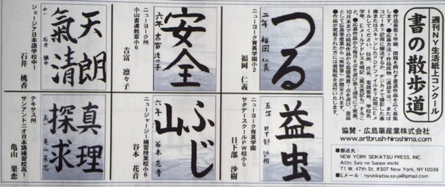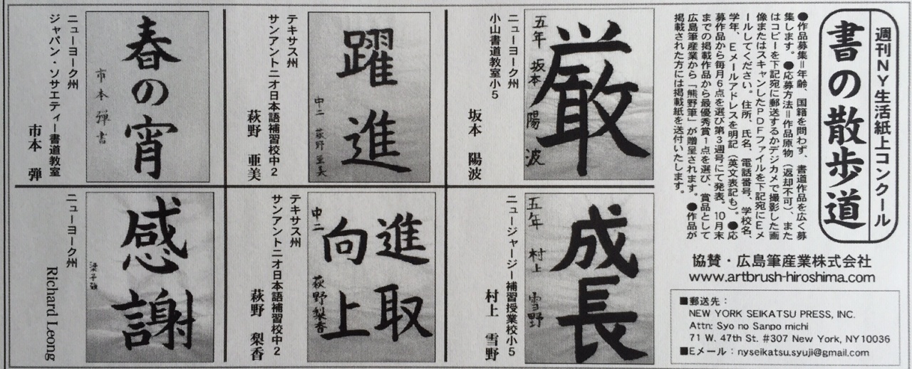 The excellent "shodo" (calligraphy) work announcement in June at the "shodo" contest in "Shukan NY Seikatsu" (Newspaper in NYC) which we sponsord. You can see "Shukan NY Seikatsu" from below website.(P19)