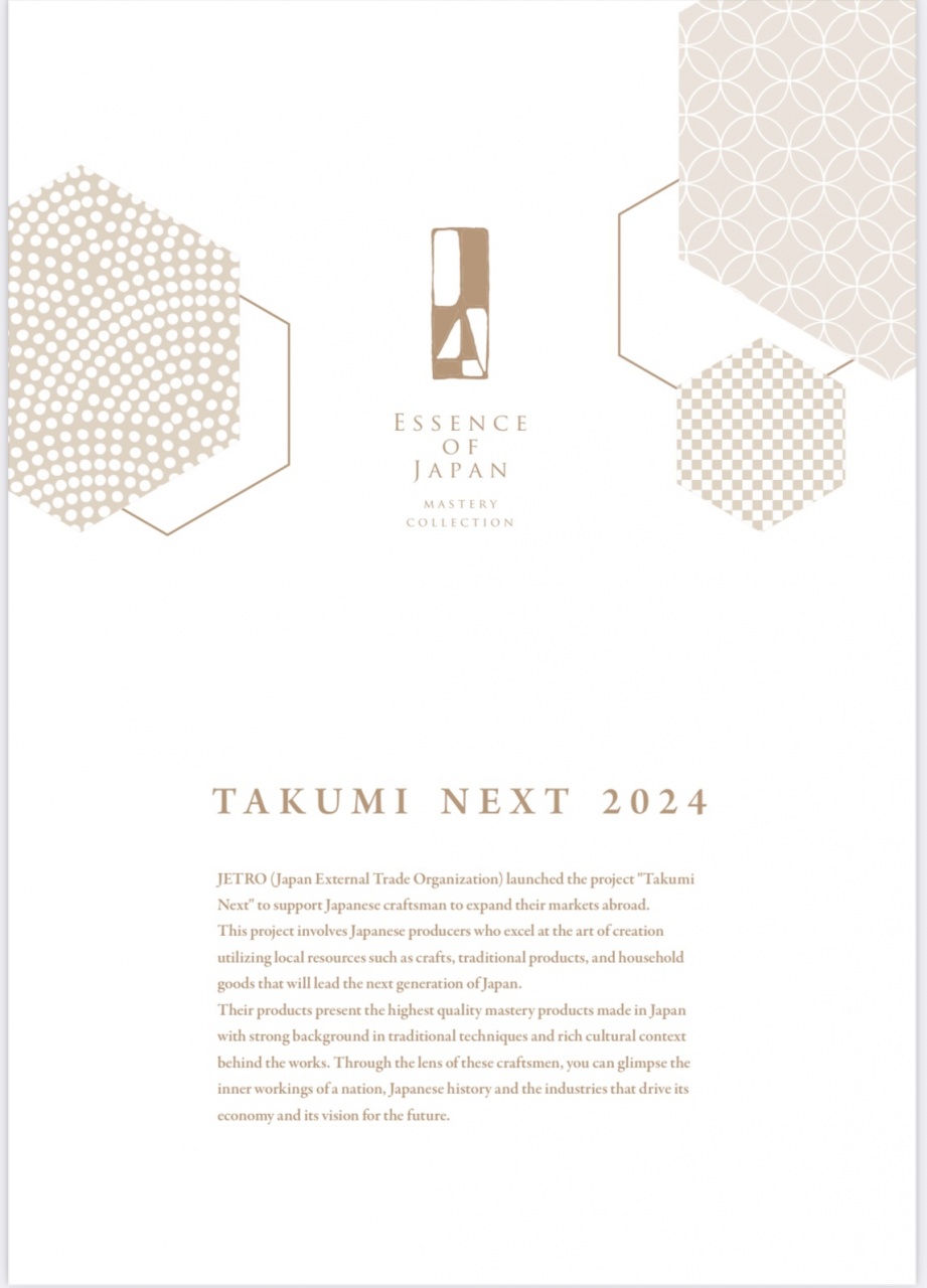 JETRO is launching the "TAKUMI NEXT 2024" project, which aims to support the export of attractive crafts, traditional handicrafts, and daily necessities from various regions across Japan. This year, 190 companies from 34 prefectures were selected as "Takumi" companies that represent the next generation of craftsmanship.