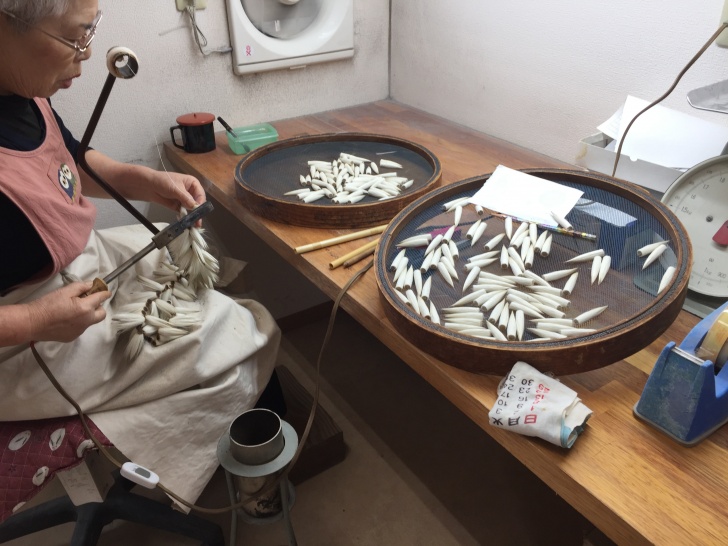 繰り込みは軸に穂首をつけて完成品にする工程です。軸は、竹や桜の木等から作られています。繰り込み台の上で筆の軸を回転させ、穂首が入りやすいサイズになるように軸の内側を均等に削ります。その後接着剤で穂首を軸に接着します。