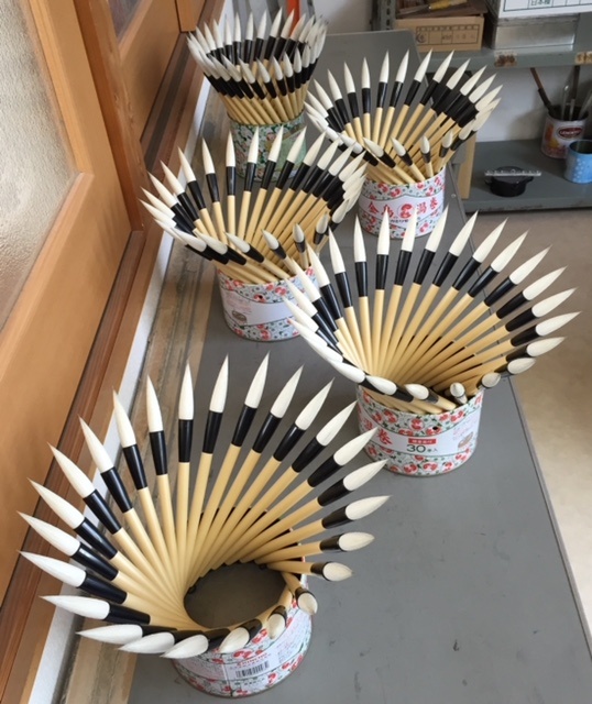 仕上げした筆を軒下や室内で充分に自然乾燥させます。十分に乾燥した筆の軸に、工房や筆の名前が彫刻刀で刻まれていきます。彫った部分に色を入れて完成です。