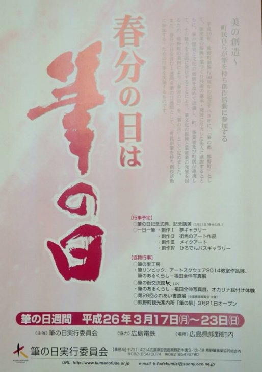 2014年3月20日 木曜日 イベント 平成26年3月21日(祝・金)は「筆の日」です。 当日は10時から「筆の日記念式典」を筆の里工房にて行います。 また3月17日(月)から23日(日)は「筆の日週間」で、筆の里工房をはじめ町内各地でイベントやギャラリーが予定されています。 是非ご参加下さい。