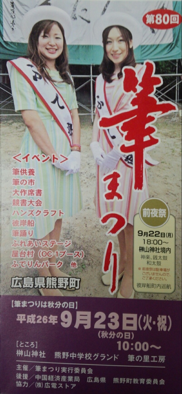 2014年9月12日 金曜日 イベント 第80回筆まつり 2014年9月23日(火・祝)は熊野町の一大イベント”筆まつり”が開催されます。 筆供養、大作席書、競書大会、筆の市などなど多数のイベントが予定されています。 この機会に是非とも熊野町にお越し下さい。