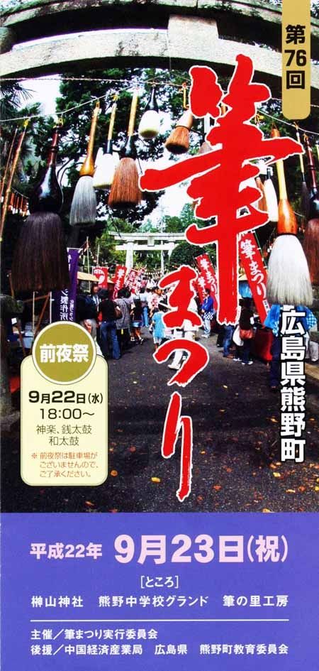 中国経済産業局、広島県、熊野町教育委員会の後援を受けて、来る9月23日榊山神社を中心に「第76回筆まつり」が開催されます。