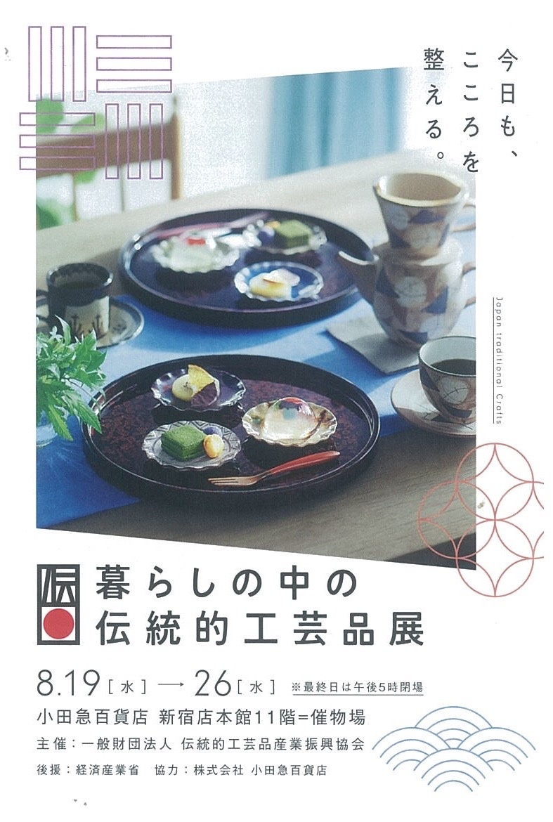 2020年8月16日 日曜日 イベント 「暮らしの中の伝統的工芸品展」出展のお知らせ 「今日も、こころを整える。 暮らしの中の伝統的工芸品展」 8月19日(水)から26日(水)まで 小田急百貨店 新宿店 本館11階にて 伝統的工芸品産業振興協会主催の 「暮らしの中の伝統的工芸品展」 が催されます。 北は青森の津軽塗から 南は鹿児島の本場大島紬まで、 全国から約50の伝統的工芸品の 作り手が参加します。 当社が伝統的工芸品「熊野筆」を 代表して出展します。 是非お立ち寄りください。