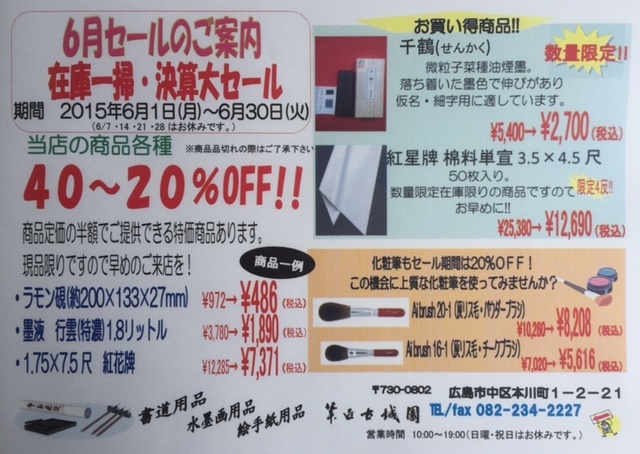 2015年6月24日 水曜日 広島店「筆匠古城園」 決算大セール中です! 筆匠古城園(広島店)では、年度末の決算セールを行っております! 書道用品や熊野化粧筆が40?20%オフです。 6月30日までです。 この機会に是非お買い求めください!