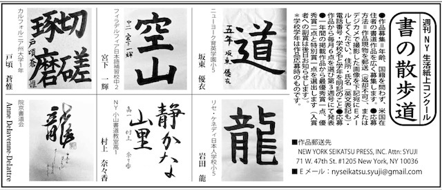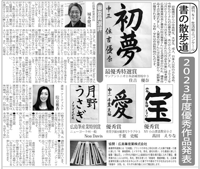 当社が協賛しているNYの「週刊NY生活」の紙上書道コンテスト。